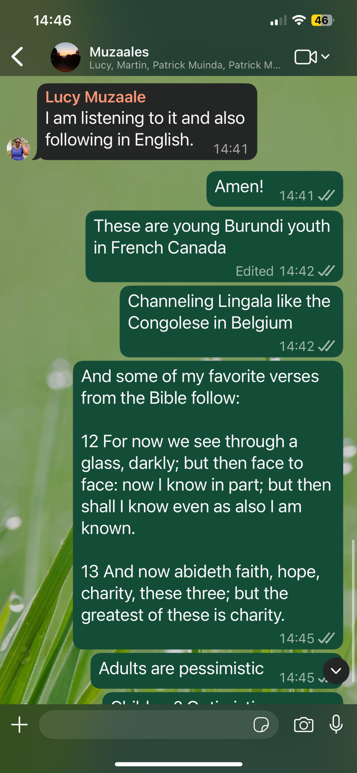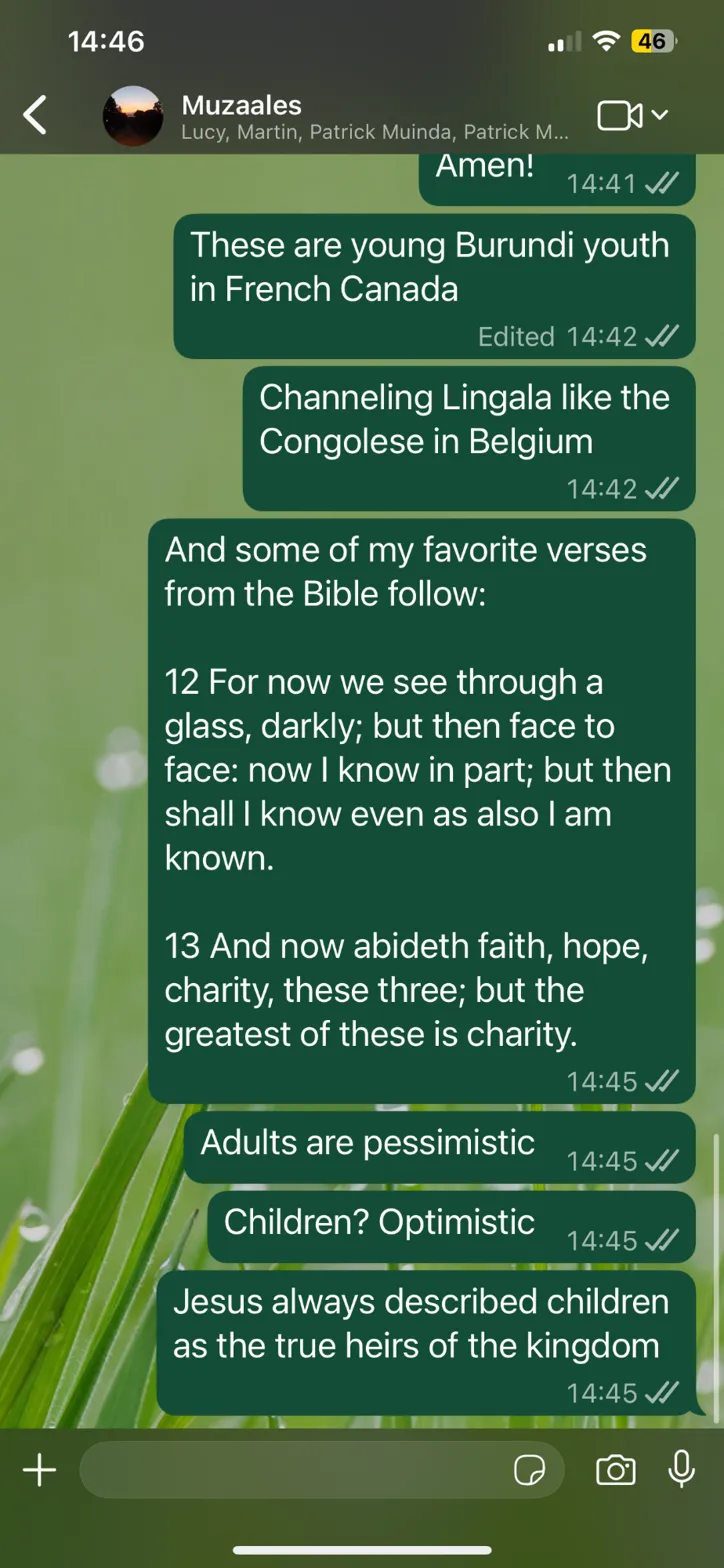 (Note: Typos and formatting preserved as appearing in the screenshot, e.g., “Burundi youth” likely means “Burundian youth”; “Congoleseese” and “Belguim” as shown. Bible verses from 1 Corinthians 13:12-13, KJV translation. The conversation appears to reference listening to something—possibly audio/podcast in French with English subtitles—featuring Burundian youth channeling Lingala music/styles, akin to Congolese diaspora in Belgium.)