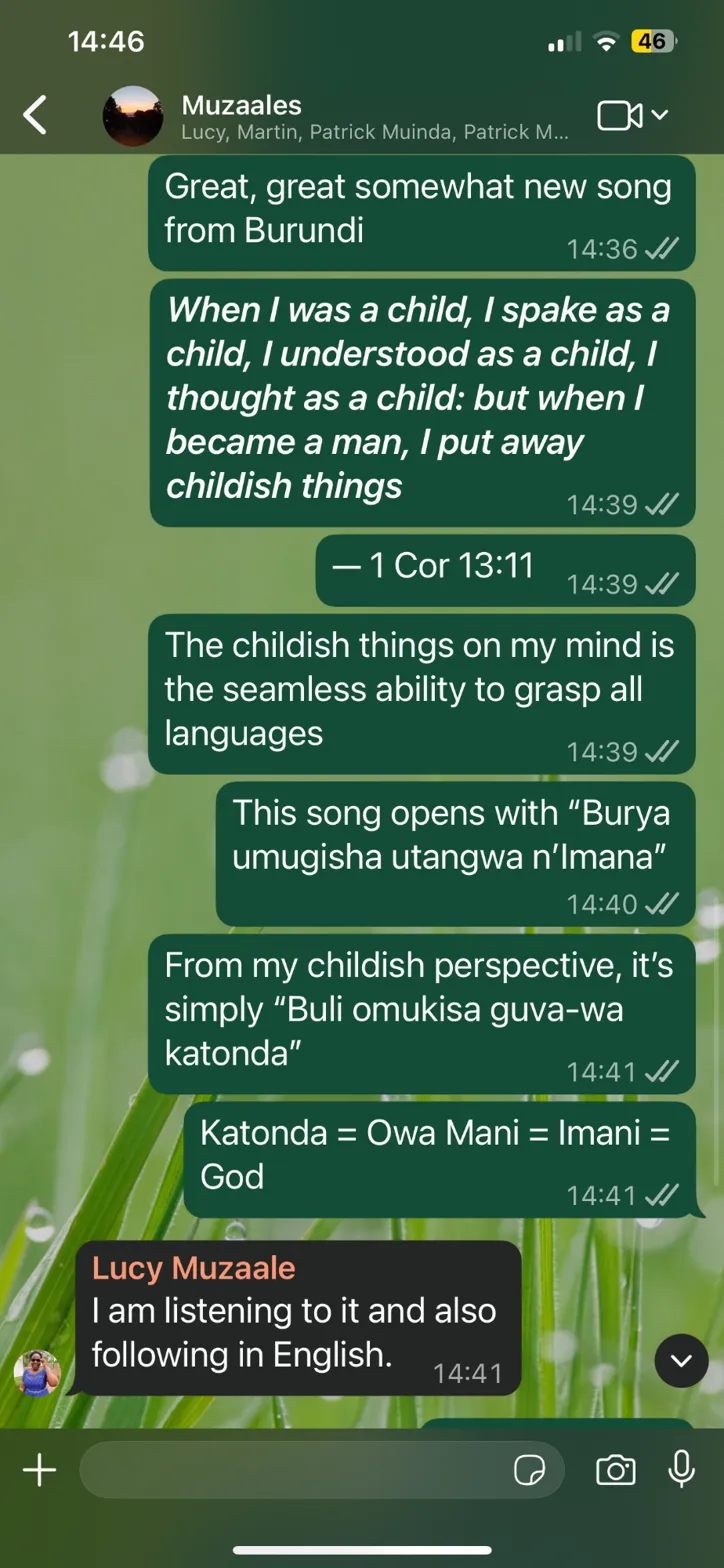(Note: Typos preserved as in screenshot, e.g., “Remdemption” likely “Redemption”; “Burundii” for “Burundi”; “spake” archaic from KJV Bible. This appears to continue the previous chat’s theme—Burundian youth/music (possibly gospel/redemption song in Kirundi) and 1 Corinthians 13:11: “When I was a child, I spake as a child, I understood as a child, I thought as a child…”. The video link points to a Burundian gospel track by artists like “Turikuvuga Imana” or similar, based on lyrics/themes of gratitude and praise.)