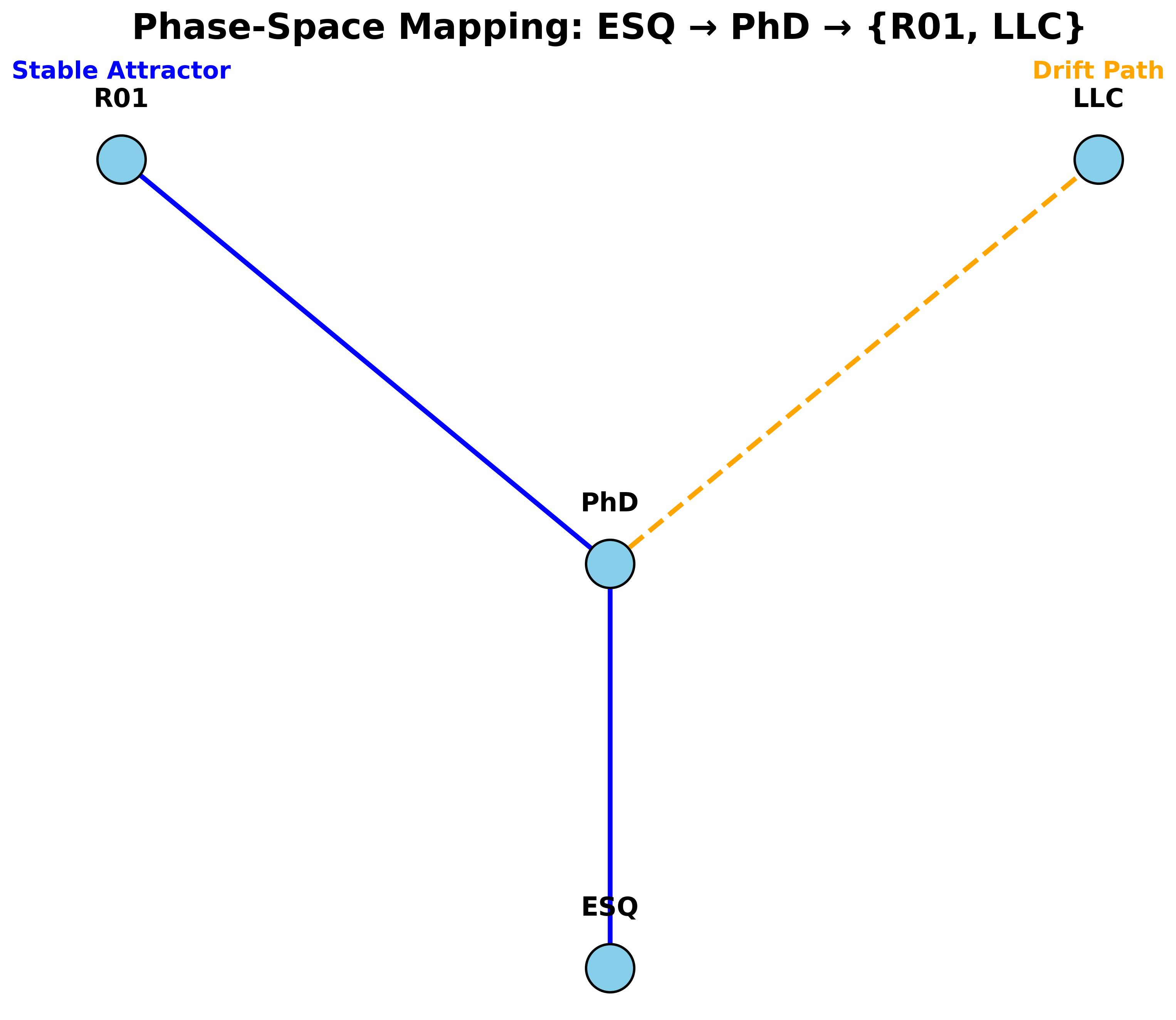It visually captures your framing: ESQ as the initial condition, PhD as the branching node, with R01 as the structured attractor and LLC as the drift trajectory.