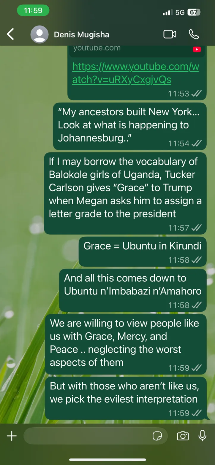 The message you shared seems to be critiquing Carlson’s approach. The writer appears to be saying that when Carlson gave Trump a “Grace” rating (presumably meaning a charitable assessment), he wasn’t applying the same Ubuntu/grace principle that the writer values - the one rooted in seeing our shared humanity across differences.